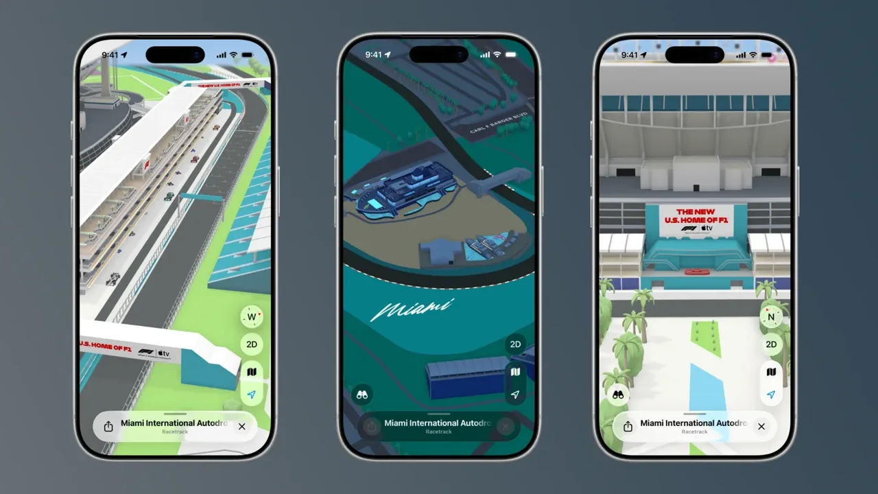 Apple, Miami International Autodrome pistini detaylı bir şekilde haritalara dahil etti. Kullanıcılar, pistin genel görünümünün yanı sıra Finish Line, The Marina ve tribünler gibi önemli noktaları 3D olarak inceleyebiliyor. Hatta Pit Building yapısı, yarış araçlarıyla birlikte üç boyutlu modelleme olarak uygulamada yer alıyor.